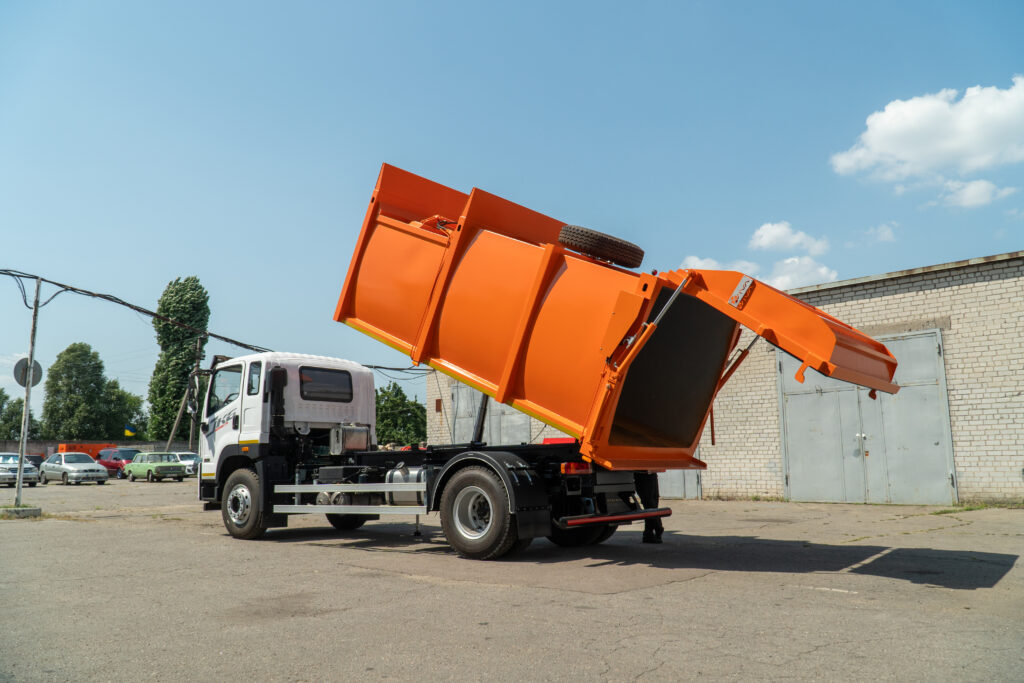 Вивантаження здійснюється самоскидним методом. Бункер піднімається гідравлічними циліндрами, а задній борт з автоматичними замками щільно закривається, запобігаючи просипанню відходів. Така конструкція гарантує тривалий ресурс експлуатації та мінімальні витрати на обслуговування.