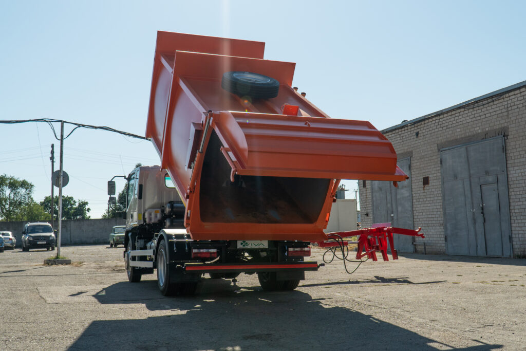Вивантаження бункера здійснюється самоскидним методом. Гідравлічні циліндри забезпечують плавне підняття кузова, а задній борт із гідроприводом та автоматичними замками щільно закривається, запобігаючи просипанню відходів.