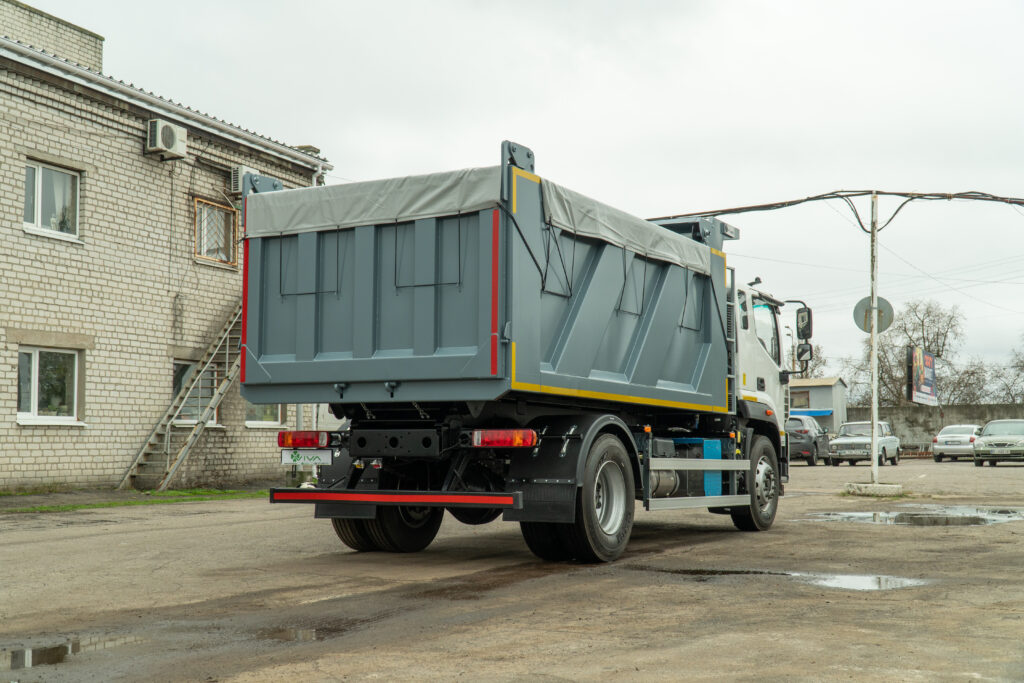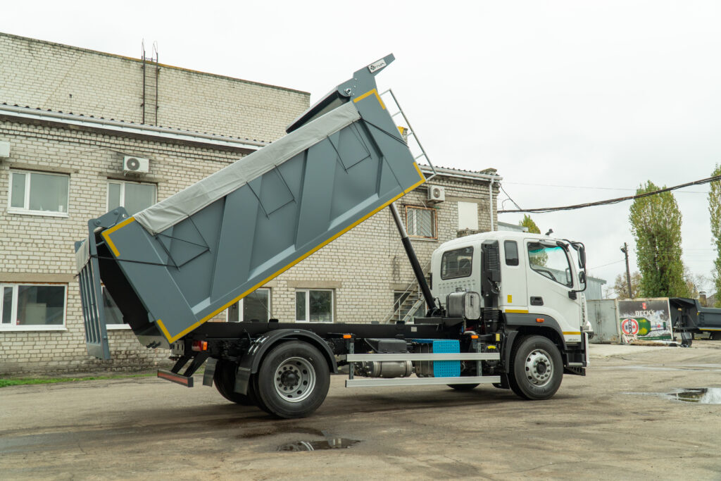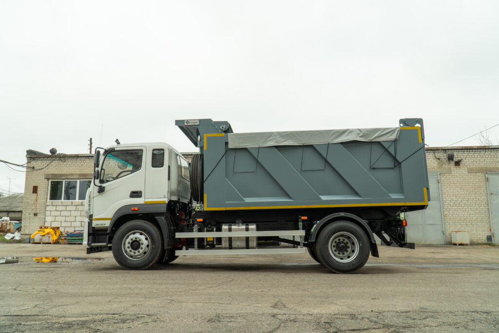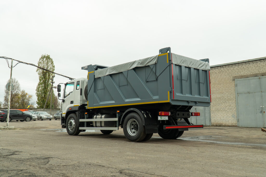 Самоскид оснащений ПВХ-тентом із системою змотування, який захищає вантаж і спрощує роботу оператора, а антигравійне покриття днища подовжує ресурс кузова та зберігає його стан навіть після тривалого використання. Практичний сірий колір обрано не лише з естетичних міркувань, а й з урахуванням щоденної експлуатації.