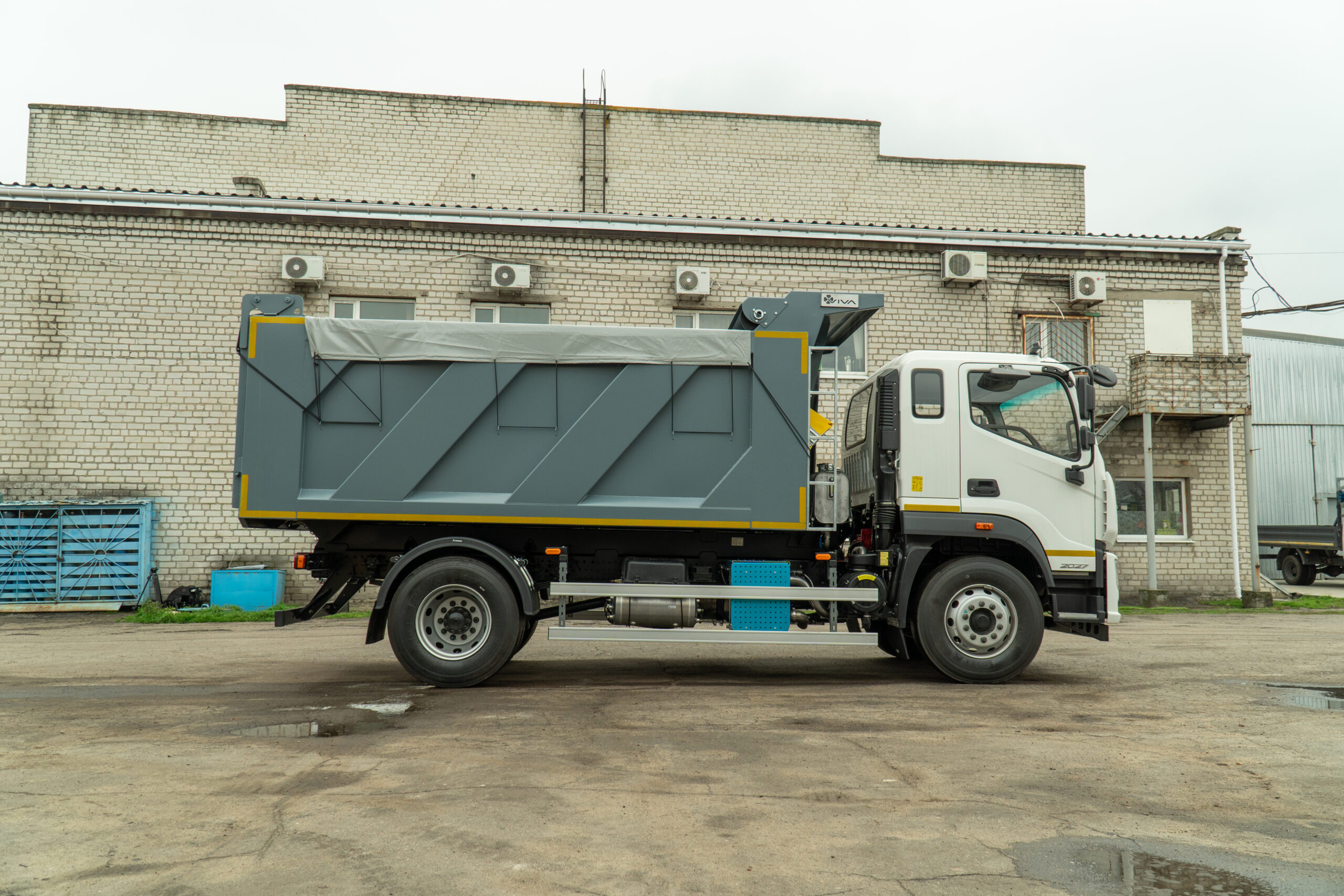 | Комплектація | автоматичні замки заднього борту кузова, антигравійний захист надрамника та зовн. днища кузова, бокові та задній захисні протипідкатні пристрої, бронзові підшипники ковзання для фронтального циліндру, гальванічне покриття всіх пальців, гачки для кріплення тенту, гідравлічний бак 60 л з н/ж сталі з фільтром та краном, гідравлічний насос шестеренчатий, гідророзподільник IPH, Італія, гідроциліндр підйому кузова INTERPUMP HYDRAULICS, Італія, два протипідкатних башмака з кронштейнами, денні ходові вогні, джойстик керування IPH, Італія, електричний підігрів дзеркал, електросклопідіймачі, зумер заднього ходу, кондиціонер, кронштейн запасного колеса з лебідкою, кут підйому не менше 45°, магнітола (радіо/MP3), матеріал кузова та надрамника – ST 355, одна гарячеоцинкована драбина на кузові, пластикові крила для коліс задньої вісі, пластикові крила з бризковиками, рульова колонка, що регулюється, спальне місце, функція стряхування кузова при розвантажені, центральний замок |