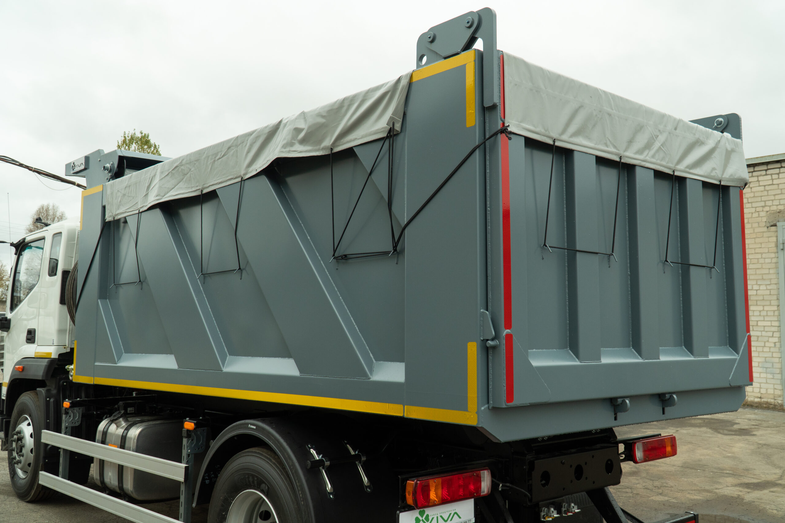 | Комплектація | автоматичні замки заднього борту кузова, антигравійний захист надрамника та зовн. днища кузова, бокові та задній захисні протипідкатні пристрої, бронзові підшипники ковзання для фронтального циліндру, гальванічне покриття всіх пальців, гачки для кріплення тенту, гідравлічний бак 60 л з н/ж сталі з фільтром та краном, гідравлічний насос шестеренчатий, гідророзподільник IPH, Італія, гідроциліндр підйому кузова INTERPUMP HYDRAULICS, Італія, два протипідкатних башмака з кронштейнами, денні ходові вогні, джойстик керування IPH, Італія, електричний підігрів дзеркал, електросклопідіймачі, зумер заднього ходу, кондиціонер, кронштейн запасного колеса з лебідкою, кут підйому не менше 45°, магнітола (радіо/MP3), матеріал кузова та надрамника – ST 355, одна гарячеоцинкована драбина на кузові, пластикові крила для коліс задньої вісі, пластикові крила з бризковиками, рульова колонка, що регулюється, спальне місце, функція стряхування кузова при розвантажені, центральний замок |