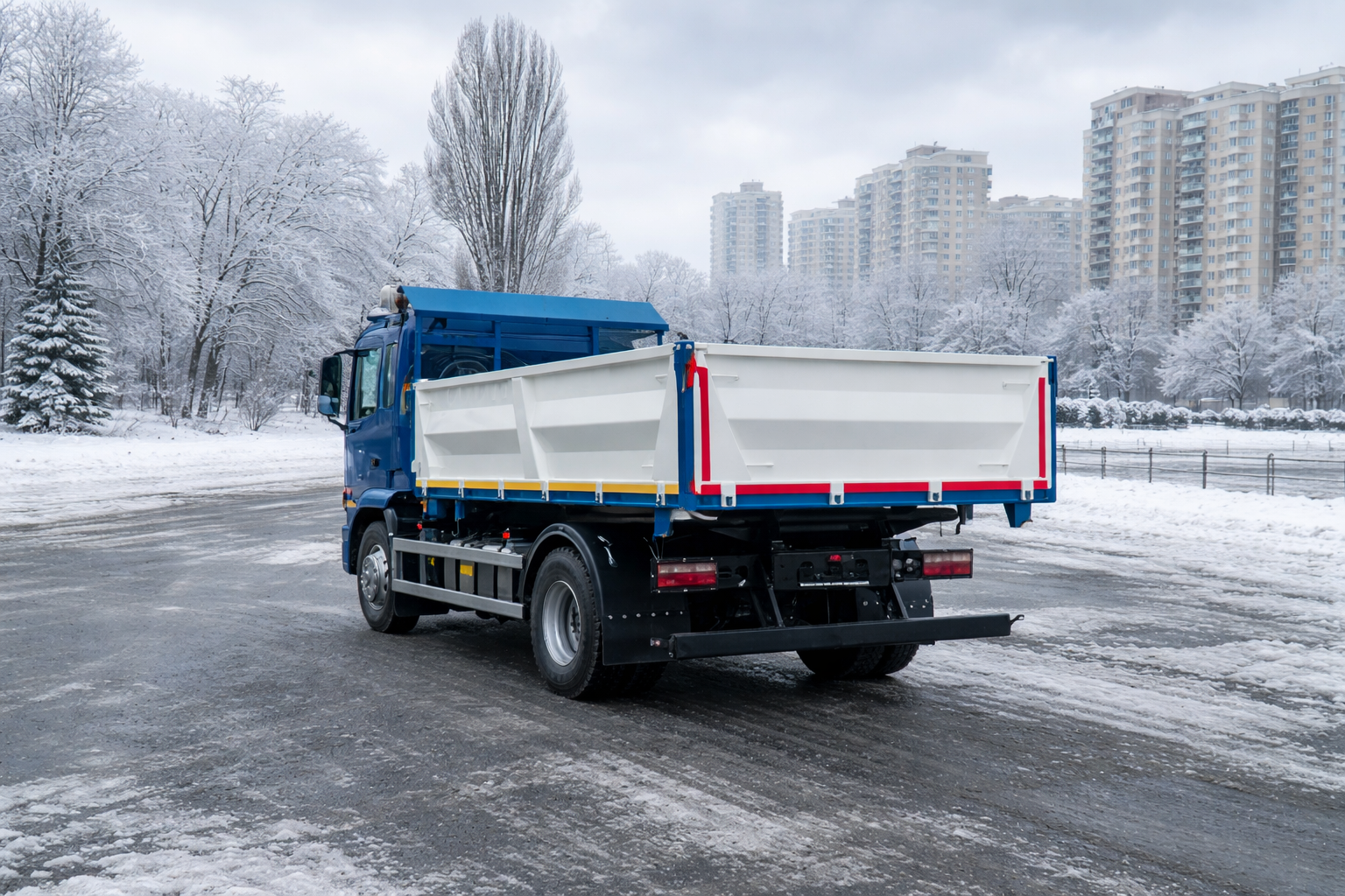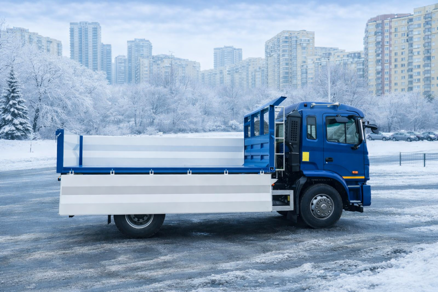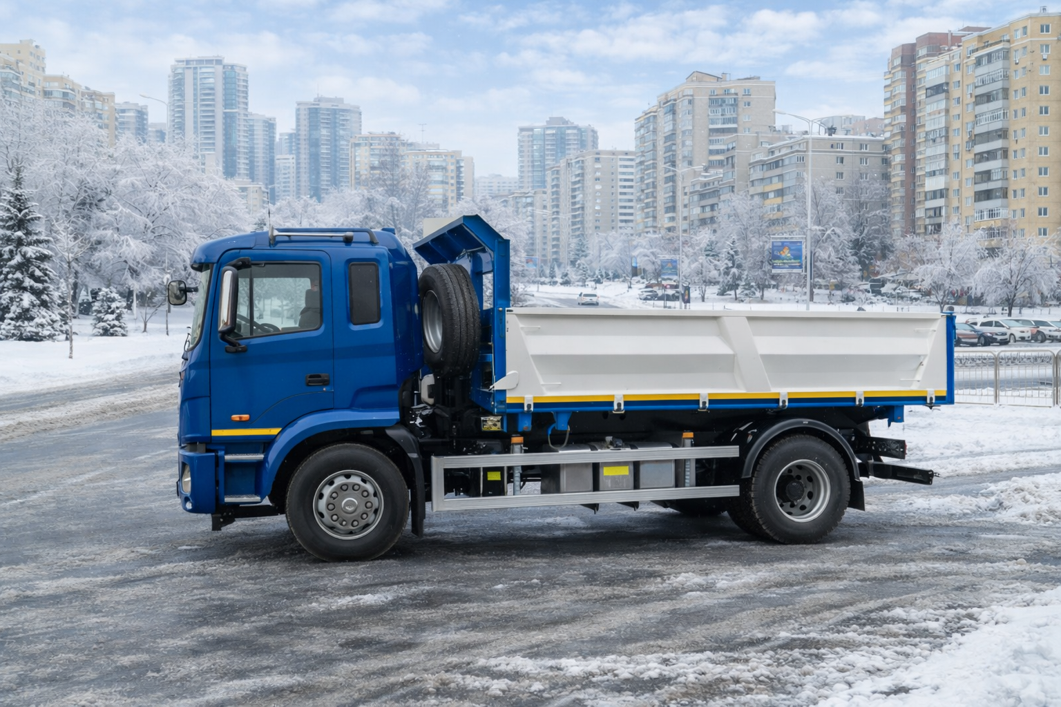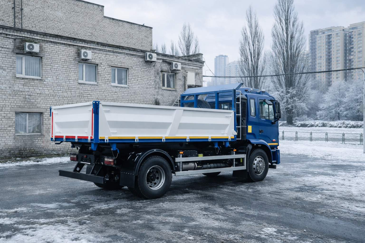 | Комплектація | ABS, ASR, ESC, антигравійний захист надрамника та зовн. днища кузова, бокові та задній захисні протипідкатні пристрої, випускне допоміжне гальмо, гідравлічний бак 60 л з н/ж сталі з фільтром та краном, гідравлічний насос шестеренчатий IPH, Італія, гідророзподільник IPH, Італія, гідроциліндр підйому кузова INTERPUMP HYDRAULICS, Італія, два протипідкатних башмака з кронштейнами, джойстик керування IPH, Італія, додаткове утеплення кабіни, електросклопідйомники, задній стабілізатор поперечної стійкості, захисний козирьок, що знімається, кондиціонер, кронштейн запасного колеса з лебідкою, круїз-контроль, кут підйому не менше 45°, матеріал кузова та надрамника – ST 355, одна гарячеоцинкована драбина на кузові, опалювач салону підвищеної продуктивності, підготовка під встановлення другого ряда бортів, пластикові крила для коліс задньої вісі, пневмосидіння, пружини підтримки бокових бортів, радіоприймач з USB, антена, динаміки, функція стряхування кузова при розвантажені |