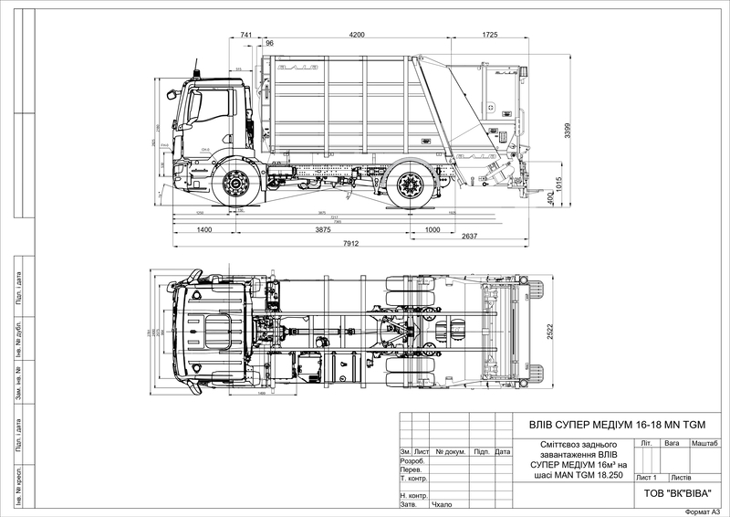 Сміттєвоз заднього завантаження типу «ВЛІВ СУПЕР МЕДІУМ 16-18 MN TGM» для транспортування твердих побутових відходів на базі автомобільного шасі MAN TGM 18.250 призначений для механізованого збору твердих побутових відходів, їх ущільнення, транспортування і механізованого вивантаження в місцях знешкодження. Сміттєвоз являє собою автомобільне шасі MAN TGM 18.250, на якому змонтоване спеціальне обладнання виробництва «ВЛІВ»: бункер, виштовхуюча плита, підйомна задня частина, ліфтер, трансмісія з масляним насосом, гідросистема, електрообладнання