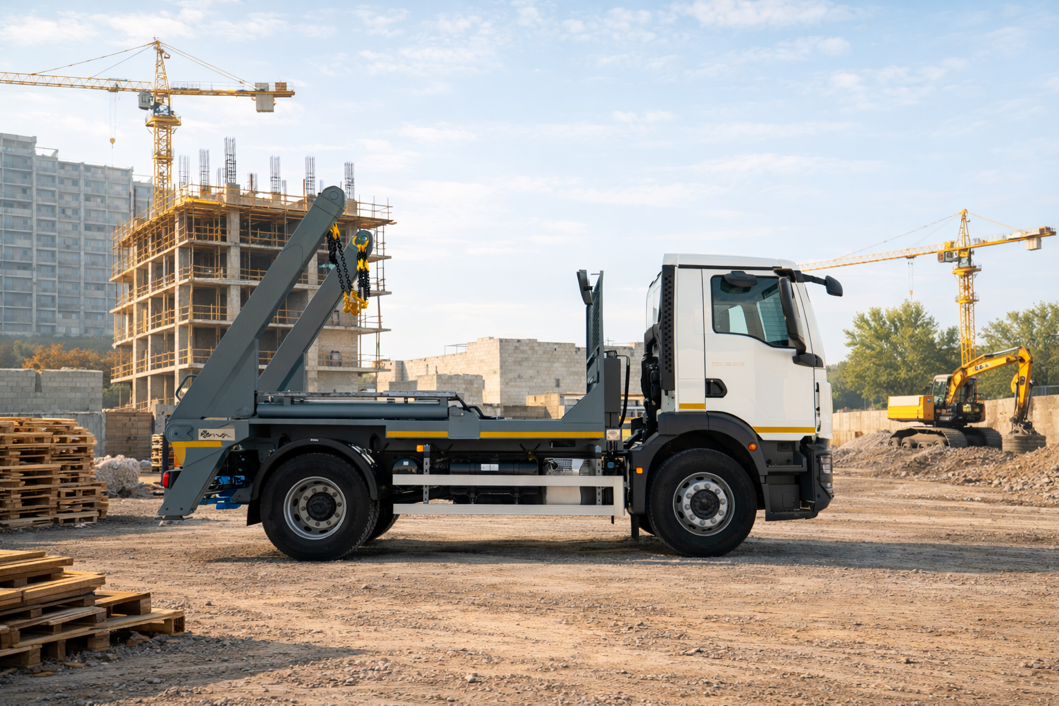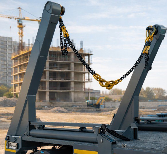 | Комплектація | бак для оливи з пристроєм контролю рівня, бокові захисні протипідкатні пристрої, гідравлічний насос шестеренчатий, два аутригери (домкрати), дві незалежні стріли, що керуються окремо, зовнішній ручний пульт керування, обладнання адаптовне до конейнерів DIN 30720, стопорний гак на цепному приводі, стропи з захватами для контейнерів DIN 30720 |