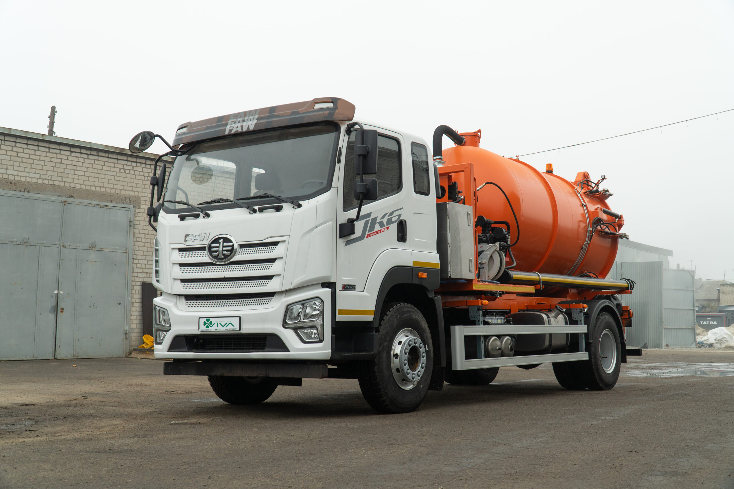 Вакуумний автомобіль VIVA АС 1105 на базі шасі FAW CA5181 призначений для збору, транспортування та зливу рідких відходів, що не містять вибухонебезпечних або горючих речовин. Конструкція включає герметичну цистерну об’ємом 9 м³, вакуумний насос італійського виробництва з гідравлічним приводом та автоматичною системою змащення, приймальний люк зі шлангом, систему керування кранами та трубопроводом, сигнально-запобіжний пристрій та додаткове електрообладнання.