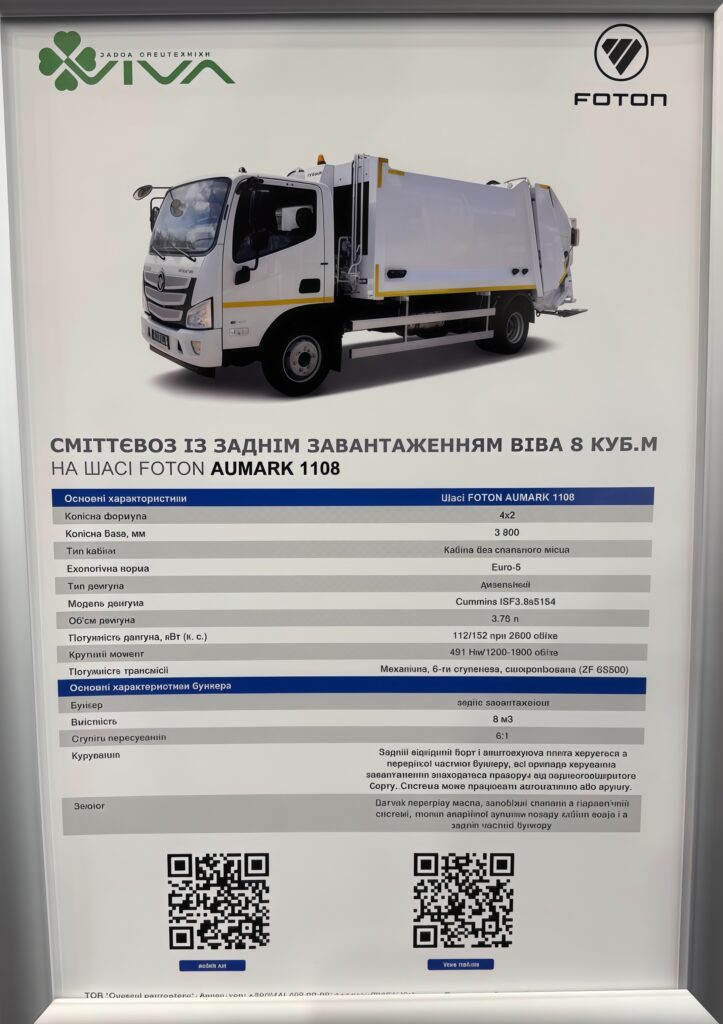 Завод спецтехники VIVA также присоединился к этому мероприятию и представил современное технологическое решение, спроектированное для эффективной работы в коммунальном секторе мусоровоз задней загрузки СУПЕР МІНІ 8-10 FT 1108 на базе шасси FOTON AUMARK.