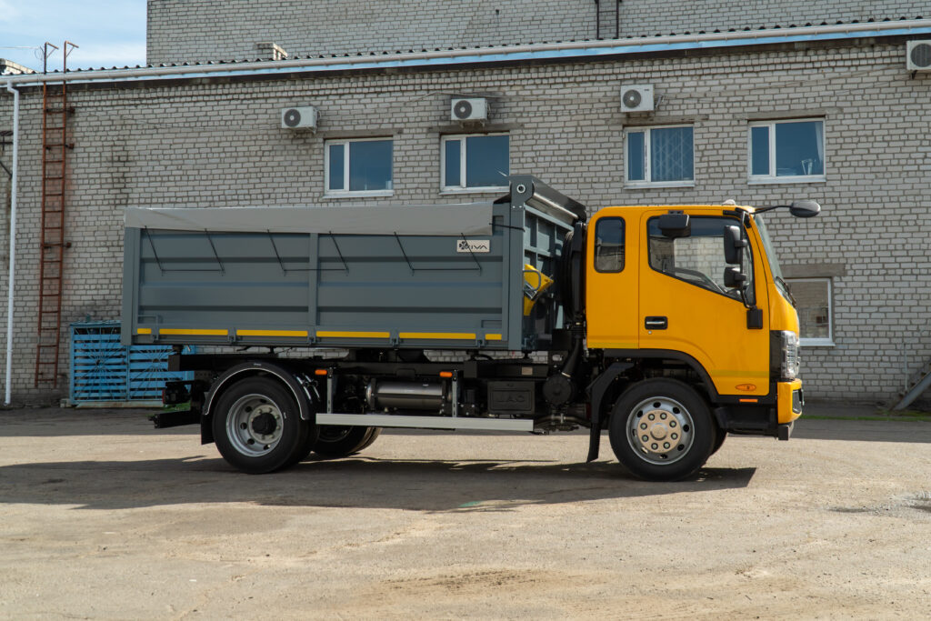 Самосвал оснащён стальным кузовом объёмом 13 м³ и грузоподъёмностью 10 тонн, что обеспечивает оптимальную производительность при перевозке сыпучих материалов. Кузов изготовлен из конструкционной стали: толщина днища — 4 мм, бортов — 3 мм, а задний и боковые борта стандартно оборудованы механическими замками. Такая конструкция гарантирует долговечность, устойчивость к нагрузкам и простое обслуживание.