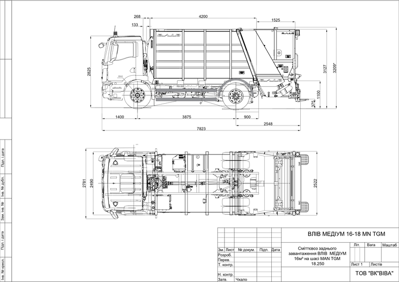 Мусоровоз задней загрузки типа «ВЛИВ СУПЕР МЕДИУМ 16-18 MN TGM» для транспортировки твёрдых бытовых отходов на базе автомобильного шасси MAN TGM 18.250 предназначен для механизированного сбора твёрдых бытовых отходов, их уплотнения, транспортировки и механизированной выгрузки в местах утилизации.