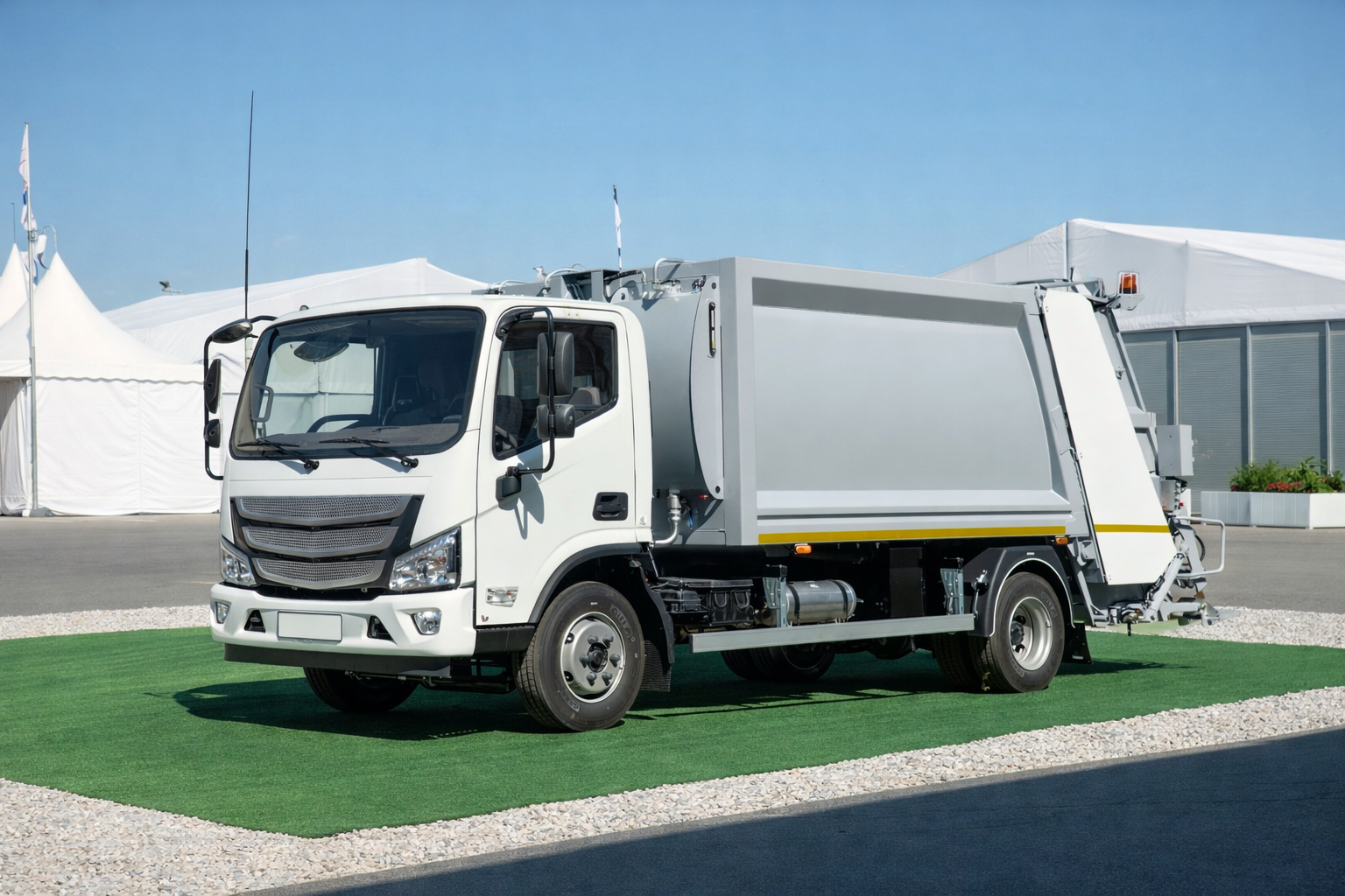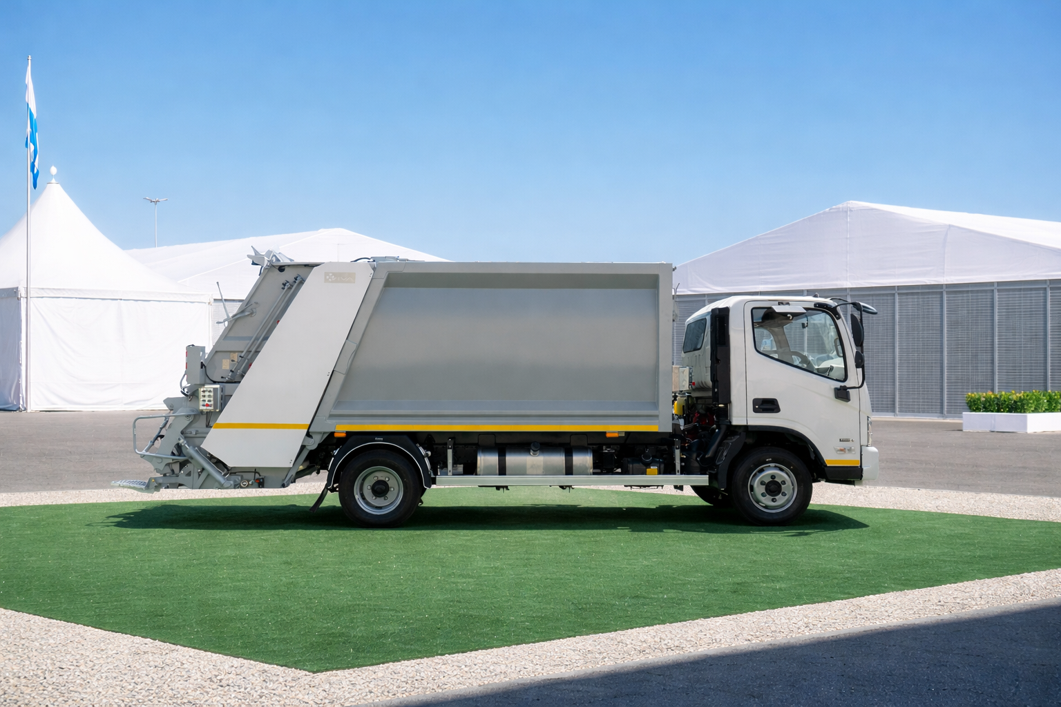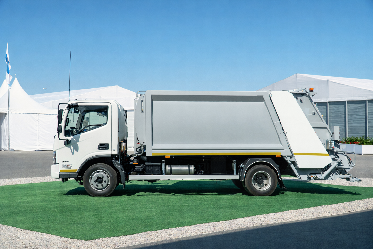 Бункер объёмом 8 м³ изготовлен из стали HARDOX, что обеспечивает высокую прочность и долговечность, а компактные размеры позволяют эффективно работать в условиях плотной городской застройки и узких улиц.